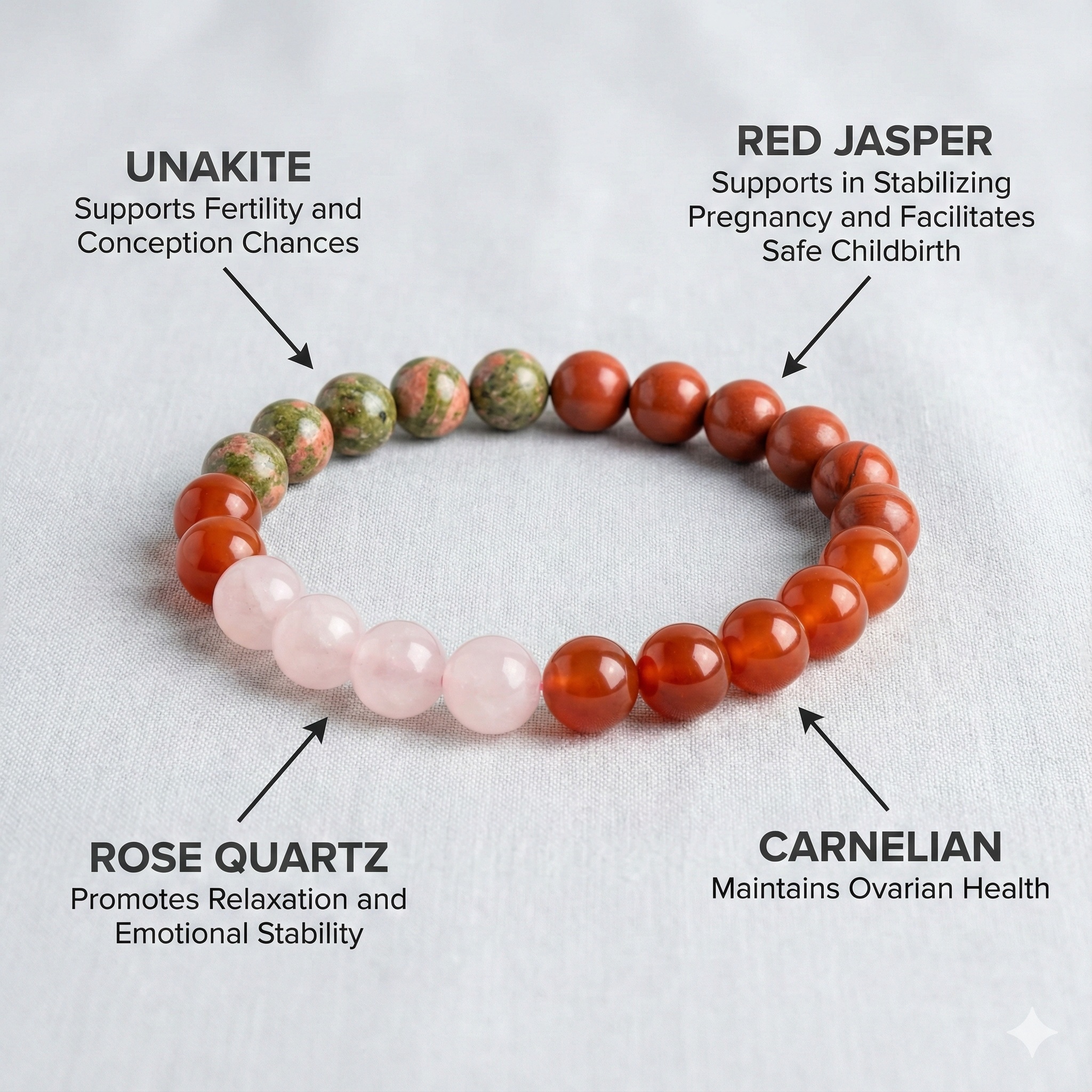 The Mother Care Bracelet is a thoughtfully designed crystal bracelet created to support emotional balance, strength, nurturing energy, and overall well-being. Made with a harmonious combination of Unakite, Carnelian, Rose Quartz, and Red Jasper, this bracelet is ideal for mothers, expecting mothers, or women who give care and support to others in their daily lives.