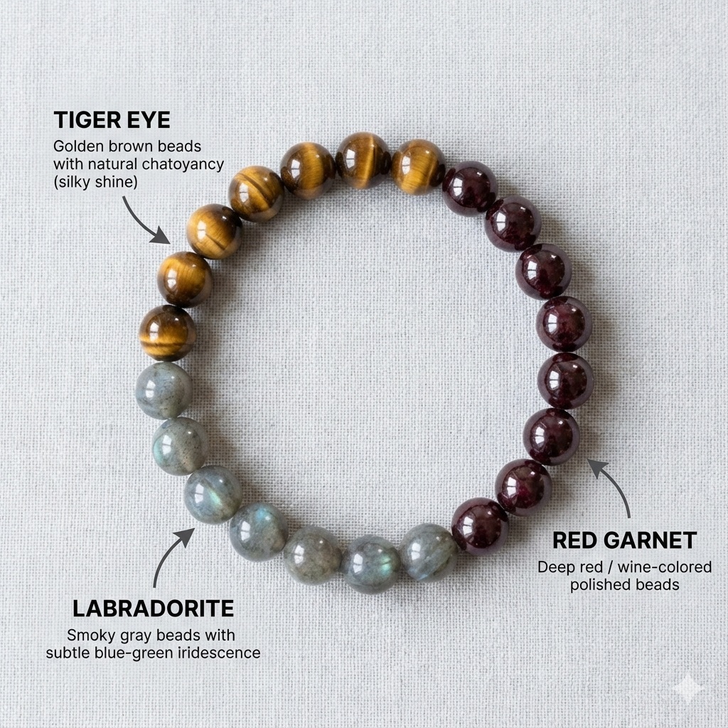 Tiger’s Eye is known for enhancing focus, confidence, and practical decision-making. It helps the wearer stay grounded while moving forward with clarity and determination. Red Garnet supports strength, endurance, and commitment, encouraging persistence and disciplined effort. It helps maintain motivation during challenging situations and supports emotional resilience. Labradorite is associated with mental clarity, intuition, and protection, helping individuals stay balanced while adapting to change and responsibility.