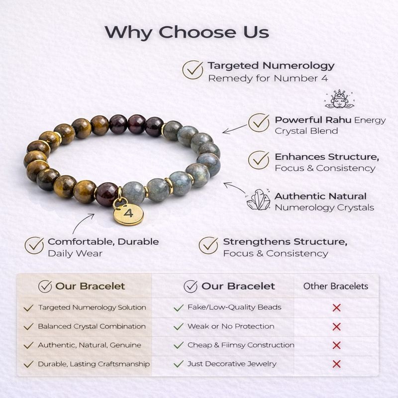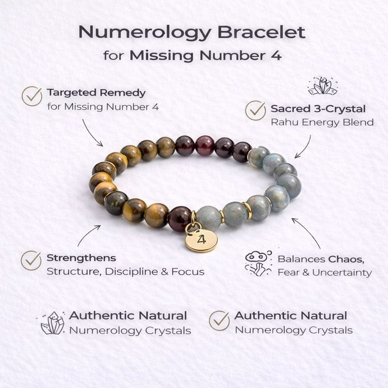 The Numerology Bracelet for Missing Number 4 is specially designed for individuals who lack the vibration of Number 4 in their numerology chart. Number 4 represents stability, discipline, structure, hard work, patience, and practical thinking. When this number is missing, a person may struggle with inconsistency, lack of focus, impatience, or difficulty building long-term stability in life.